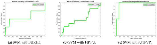 Further, HKPU performed better than UTFVP for all three pre-trained CNNs used (AlexNet, VGG1, and VGG19). The ROC curves, plotted for the False Positive Rate vs. True Positive Rate, shown in Figure 11d–i, demonstrate that the AUC is higher for the combined database comprising all three fingers, i.e., the center, ring and index fingers, for NIRHI in comparison with the other two databases, i.e., HKPU and UTFVP.