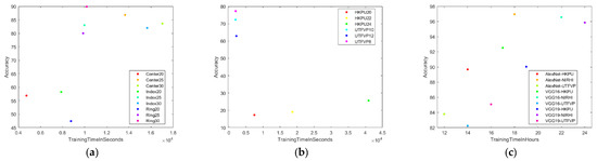 Training time versus accuracy scatter plots. (a) SVM—NIRHI. (b) SVM—HKPU and UTFVP. (c) CNN—all databases.