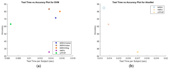 Figure 13 shows the testing time versus accuracy scatter plots for the AlexNet and SVM models. Figure 13b shows that accuracy was the highest and testing time was the lowest for the NIRHI database in comparison with the other two databases for AlexNet. From Figure 13a, it is evident that, for SVM, NIRHI had the highest accuracy values, and the testing time for candidate images was also the highest. However, comparatively, the testing time for NIRHI was not much higher (in milliseconds). Hence, it may perform satisfactorily in our proposed multimodal biometric system without creating any extra delay in making an identification decision.