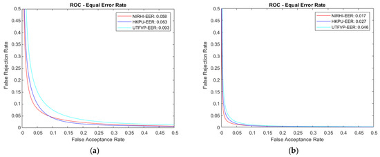 The Equal Error Rate (ERR) is a statistical performance metric that indicates at which point on the ROC curve the value of the False Acceptance Rate (FAR) is equal to the False Rejection Rate (FRR). A lower value for the EER is desirable for better identification performance of a biometric system. EER values for all three databases are shown for Approaches 1 and 2 in the ROC curves of Figure 14a and Figure 14b, respectively.