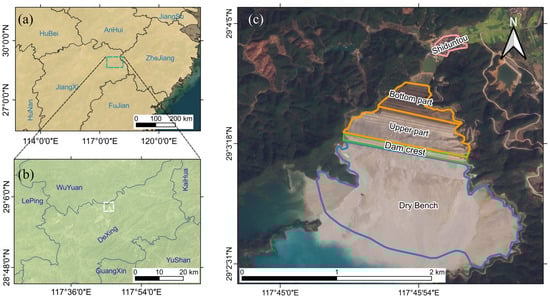 Dexing City is located in Jiangxi Province, China, on the southeastern edge of the Degu Land in southern Jiangnan, and on the transitional zone between the Zhe-Gan depression and the northwestern side of the Northeast Gan Deep Rift. The main outcrops in the region are the shallow metamorphic facies of the Shuangqiaoshan Group of the Aurignacian System [59]. The subtropical monsoon climate zone of Dexing is mild and humid, with an average annual temperature range of 16–19 °C and an average annual precipitation of 1800 mm [64]. The Dexing Copper Mine is the largest open-pit copper mine in Asia, with a proven copper reserve of 1.63 billion tons and an annual mine production of 160,000 tons of copper, representing approximately one-fifth of the nation [58]. At the border of the Dexing Copper Mine open pit, the No.4 tailings pond was constructed, with the No.4 tailings pond having the largest volume, the largest surface area, and the largest dam volume (Figure 1) [62].