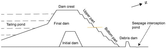 Schematic diagram of the dam profile of the No.4 tailings pond. The profile from left to right corresponds to the orientation from south-southeast to north-northeast. The orange dashed line indicates the dividing line between the upper and bottom parts.