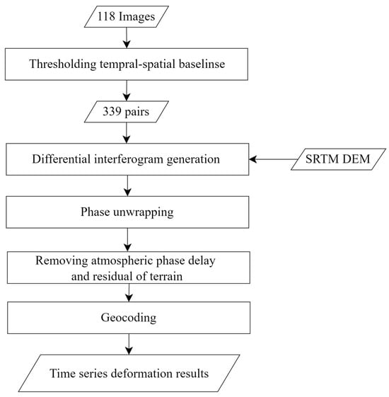 We then utilize Singular Value Decomposition (SVD) to solve the least-squares solution [54] and derive the azimuthal phase averaging rate. Multiple SAR images of the same region acquired at different time intervals and with minor geometric differences are analyzed to produce differential interferograms, which enable the detection of temporal variations of ground displacement in the LOS direction. The data processing flowchart of SBAS-InSAR is shown in Figure 3.