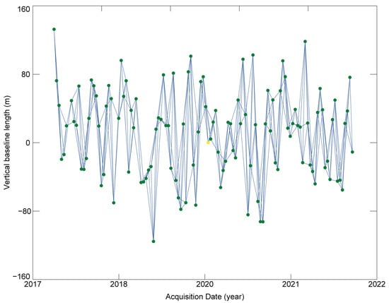 Spatio-temporal baseline network. The green dot shows the obtained image, and each blue line between two distinct locations represents an interferogram pair. The yellow dot corresponds to the co-registration reference image.