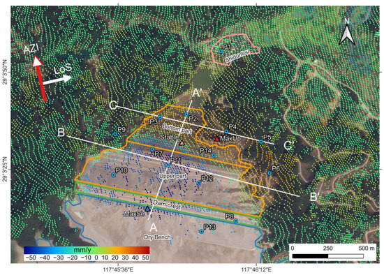The No.4 tailings pond dam and adjacent deformation rate map. The dry beach, the top of the dam, and the outer slope, the seepage interceptor pool, and the village of Shiduntou are shown from south to north in the figure. The red, blue, and yellow triangles represent the positive and negative extremes of the LOS deformation of the dam body, as well as the relative stabilization point, respectively. P1–P14 are selected specific deformation points; A, A’, B, B’, C, C’ are the starting point of three cross-sectional profiles.