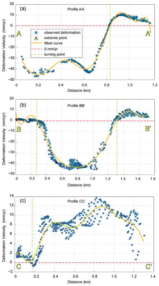 Deformation rate profiles. Deformation rate profiles for (a) line AA’, (b) BB’, and (c) CC’. The blue dot represents the average deformation rate at all sites within 30 m of the buffer zone of the line segment. The orange line represents the deformation rate fitting curve, the red dashed line represents a deformation rate of 0 mm/yr, and the green dashed line represents the location where the deformation rate is 0 mm/yr.