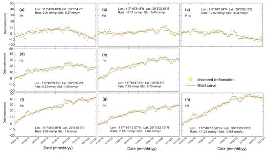 Cumulative deformation of P1–P6 (a,d,e–h), P9 (b), and P14 (c), their distribution positions are shown in Figure 5. The yellow point indicates the average deformation rate at all points within a 30 m radius centered on the point.