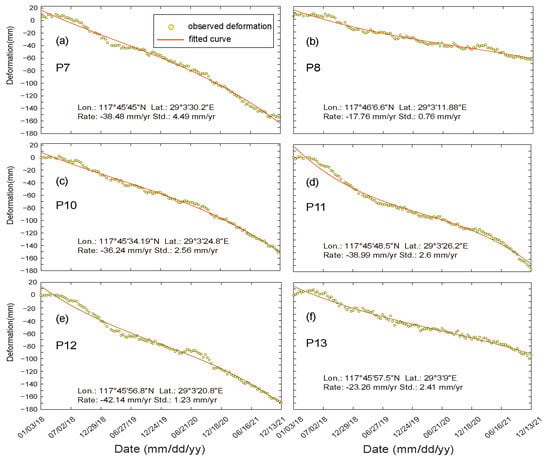 Cumulative deformation of P7 (a), P8 (b), and P10–P13 (c–f), their distribution positions are shown in Figure 5. The yellow point indicates the average deformation rate at all points within a 30 m radius centered on the point.