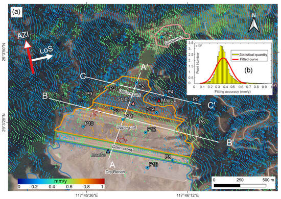 Precision and statistical chart of LOS deformation. (a) The figure of fitting accuracy. (b) The distribution of fitting accuracy. P1–P14 are selected specific deformation points; A, A’, B, B’, C, C’ are the starting point of three cross-sectional profiles.