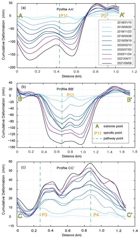 Fitting diagrams of deformation accumulation. (a) Deformation accumulation fitting plots for the AA’ line pathway region. (b) Deformation accumulation fitting plots for the BB’ line pathway region. (c) Deformation accumulation fitting plots for the CC’ line pathway region. Sub-temporal deformation accumulation for the regions of the line AA’, BB’, and CC’ pathways, where the green dashed line travels through the deformation accumulation at the deformation observation point depicted in orange text.