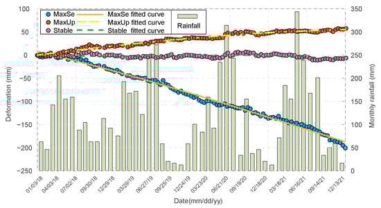 The climate of Dexing City is subtropical monsoon, with abundant precipitation, an average annual rainfall of 1800 mm, and moist springs and summers. The No.4 tailings pond has a total capacity of 835 million m3 and a catchment area of 14.3 km2, which is likely to cause the dam to fail if excessive rainfall occurs and cannot be eliminated in a timely manner. To investigate the relationship between tailings dam deformation and precipitation, we gathered the local monthly average rainfall during the deformation monitoring period and compared it to the sedimentation time series (Figure 11) [80,81]. The graph depicts an irregular distribution of precipitation throughout the year, with more precipitation in spring and summer and less in autumn and winter. Although rainwater runoff and infiltration will alter the expansion coefficient of the soil, which in turn affects the deformation characteristics of the dam body, deformation monitoring results indicate that there is no obvious correlation between the deformation amount and deformation rate of the No.4 tailings dam in the Dexing Copper Mine and the rainfall. We speculated that there were the following reasons: