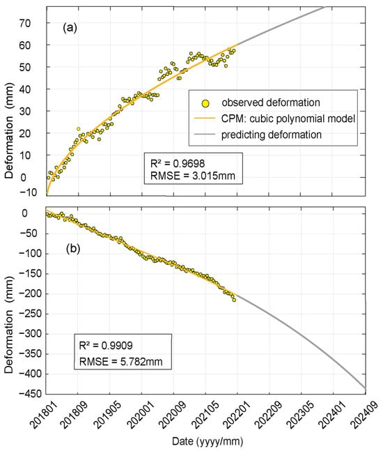 In general, these models are suitable for the regions with a flat surface and variations in deformation rate over the observation period, such as regions where the deformation velocity is first fast and then slow, with a tendency of 0 mm/yr. In contrast, the topography of our study area is more diverse, and the deformation speed remains single, and there is no sign of slowing down in the near future. Due to the quasi-linear deformation in these two places, the general consolidation model could not accurately fit the deformation time distribution characteristics. It is ultimately determined that the power function can maximally fit the deformation accumulation versus time; therefore, the deformation characteristics of the typical areas at the bottom and the top of the dam body were fitted and predicted based on the power function model (Figure 12). The R2 of the power function fitted curves was 0.9698 for the deformation of the lower portion of the dam and 0.9909 for the deformation of the upper portion of the dam. It is difficult to predict the end time of the deformation because the deformation rate of two parts of the dam body is relatively uniform during the observation time and there is no obvious variable speed. The power function fitting curve shows that the A-LOS rate of the bottom portion of the dam body is fast and then slow during the observation period, but it keeps a strong upward trend, and the annual A-LOS is about 10 mm. The M-LOS trend of the upper part of the dam body in the next two years is similar to the usual, with a quasi-linear trend M-LOS value of about 40 mm per year. In conclusion, although the change in the deformation rate of the two is not large, the change in the trend indicates that the deformation of the tailings dam may be developing in a more serious direction, and the tailings dam management personnel should formulate countermeasures.