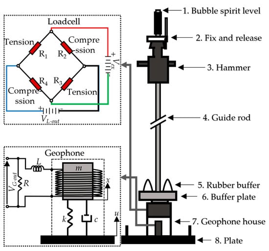 Within the mechanical frame of the LWD (Figure 1), several integral components contribute to its functionality. Primarily, the fix and release part (2) acts as a mechanism to secure the hammer (3), which has a weight range of 10–20 kg, in a precise position, or this part initiates the hammer’s release into free fall. The hammer descends as a free-falling object, guided by the rod (4) with a typical length of 0.8 m. A rubber buffer unit (5), with a typical stiffness range of 200–700 kN/m, serves as a buffer during the hammer’s descent, ensuring the uninterrupted dynamic operation of the lightweight deflectometer (LWD). The buffer plate (6) fixes the buffers and transmits the applied force to the load cell. The housing (7) functions as a load transmission intermediate and safeguards the geophone. The circular plate (8), with a diameter in the range of 0.1–0.3 m, provides support for the entire LWD, ensuring equilibrium for the precise calculations of soil parameters. Additionally, the incorporation of bubble spirit level modules (1) aids users in achieving heightened measurement accuracy by ensuring the balanced placement of the LWD.