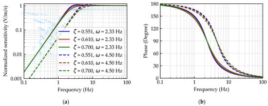 Geophone normalized sensitivity and transfer function phase with different values due to open-circuit damping and natural frequency. (a) Normalized sensitivity; (b) transfer function phase.