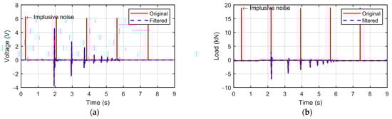 Impulsive noise removal implemented in MATLAB R2022b. (a) Original and filtered geophone signals. (b) Original and filtered load cell signals.