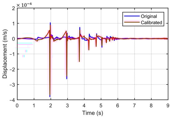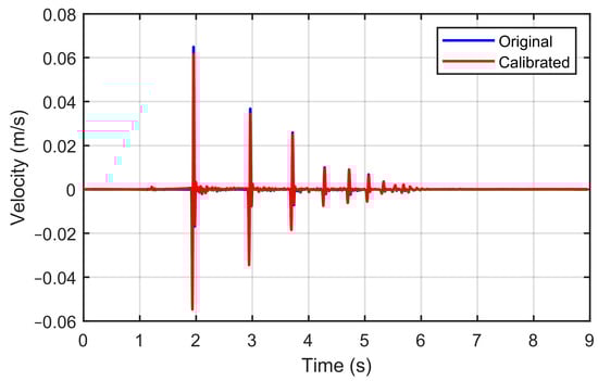 After obtaining the enhanced and removed noise output voltage (VA) time history, the signal is corrected due to the dynamic measurement error mentioned in Section 2.2.1. The correction process begins with the Fast Fourier Transform (FFT) of the sensor’s output voltage after filtering and calibrating, which is recorded in the time domain. The FFT transforms the signal to be in the frequency domain. Next, the transformed signal is multiplied by the inverse transfer function (Equation (8)). Finally, the result is brought back to the time domain by applying an Inverse Fast Fourier Transform (IFFT). These steps effectively eliminate the dynamic measurement error introduced by the geophone [23], as shown in Figure 6. This process is carried out based on the code provided by Stamp [23].