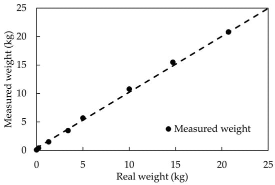 Calibration of the load cell is performed to ensure measurement accuracy. Initially, the digital reading is recorded when the load cell is in an unloaded state. Subsequently, objects with known physical weight values (within the range of 1–25 kg) are selected. These objects are placed on the load cell one by one, and the output digital reading for each object is recorded sequentially. The list of calibration factors is calculated as follows [38]: