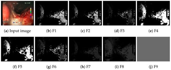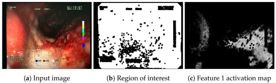 For each of the proposed features, a feature descriptor was implemented with the objective of matching definitions of the particular feature as closely as possible. Each feature descriptor was implemented in the form of a simple computer vision algorithm that transforms the input color image into a feature activation map in the form of a single-channel 2D image matching the size of the original image, where pixel intensities of the activation map reflect the strength of a given feature’s appearance in the respective part of the image. The feature descriptors were designed with an assumption of using fairly simple implementations and with a focus on vectorized image processing operations (enabling efficient execution on multicore systems). The implementations were designed using array processing methods dedicated for image processing in Python, using OpenCV and Numpy libraries. The algorithms were also tuned in terms of the choice of image processing operations and their parameters (such as kernel sizes, normalization ranges, etc.) using a novel computer-vision-oriented support tool, CVLab https://github.com/cvlab-ai/cvlab (accessed on 7 December 2023). An example of a pseudocode for the implementation of a feature descriptor (descriptor F1) is presented in Algorithm 1. The source code for the implementation of the feature descriptors is available on Github https://github.com/ambrzeski/endoblood-features (accessed on 7 December 2023). An example of a feature activation map generated by the F1 descriptor is presented in Figure 2.