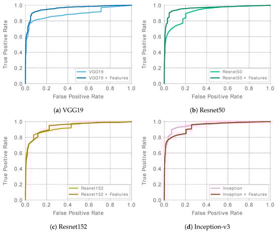 The best single ensemble results for each of the evaluated architectures are presented in Table 5. ROC curves are presented in Figure 4. In the case of the Resnet and VGG19 networks, feature-extended ensembles (denoted as “+F” ensembles) achieved higher ROC AUC values than the baseline ensembles. For the Inception v3 architecture, in turn, the baseline ensemble reached a slightly higher ROC AUC. The overall accuracy considering the remaining metrics appears to be similar for the baseline and feature-extended ensembles in the case of the VGG19, Resnet152, and Inception-v3 architectures. However, in the case of Resnet50, a clear advantage of the feature-extended ensemble was observed. It was also the feature-extended Resnet50 that achieved the highest ROC AUC score of all of the best ensembles, reaching a value of 0.963.