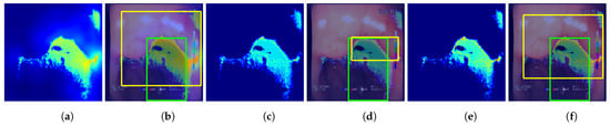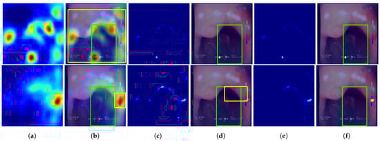 Sample predictions of the evaluated localization methods. First row—VGG19 #1 (single fold) model results, second row—VGG19+F #1 (single fold) results. Columns: (a) non-postprocessed output; (b) non-postprocessed output visualized over original image, with yellow rectangle presenting the bounding box of final result (postprocessed) and green rectangle presenting the bounding box of the reference mask; (c) non-postprocessed output; (d) non-postprocessed output visualized over original image with bounding boxes; (e) non-postprocessed output; (f) non-postprocessed output visualized over original image with bounding boxes.