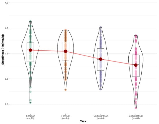 Regarding the repetition effect in tasks 1–4, pairwise comparisons revealed significant differences between test 1 and test 2 for steadiness and ML steadiness when standing on a compliant surface with eyes open (p < 0.026) and eyes closed (p < 0.001). However, for AP steadiness, test 1 and test were not significantly different on the compliant surface with eyes open (p = 0.149) but were significantly different on a compliant surface with eyes closed (p < 0.001). For the analysis of increasing difficulty across tasks 1–4, steadiness, ML steadiness, and AP steadiness, were significantly different across the four tasks (p < 0.001) (Table 4). Pairwise comparisons for the steadiness outcome showed significant differences between all tasks except between task 1 (FirmEO) and task 2 (FirmEC) (see Figure 1).