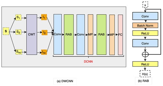 We propose DCNN by exploiting the original CNN and adding the residual attention blocks (RAB). The DCNN architecture is shown as a part of Figure 1a. The proposed DCNN includes two convolutional (Conv) layers, two RAB as in Figure 1b, two max pooling (MP), and a fully connected (FC) layer. The details of the proposed DCNN model for the layer names and each layer’s hyperparameter settings are listed in Table 2.