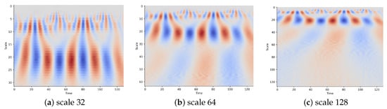To determine the appropriate parameters and a for constructing an optimal wavelet transform, we introduce an algorithm for automatically and adaptively selecting the wavelet scale in CWT. The details are shown in Algorithm 1. This algorithm consists of two procedures. The first procedure selects the optimal based on Shannon entropy, as described in []. Shannon entropy is used to assess the sparsity of wavelet coefficients. The corresponding shape factor is chosen to minimize Shannon entropy, resulting in wavelet transform coefficients with higher sparsity. The second procedure optimizes the selection of the scale parameter based on singular value decomposition (SVD), following the approach outlined in []. The goal is to obtain the maximum periodicity ratio using SVD on the coefficients matrix. This helps determine the optimal scale parameters for the wavelet transform. Figure 2 provides a visual representation of CWT images generated from a signal sequence at different scale parameters using the Morlet wavelet function. Generally, a broad range of scales can capture more information about slow changes, which can enhance classification accuracy.
