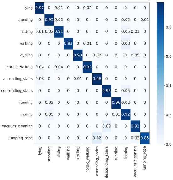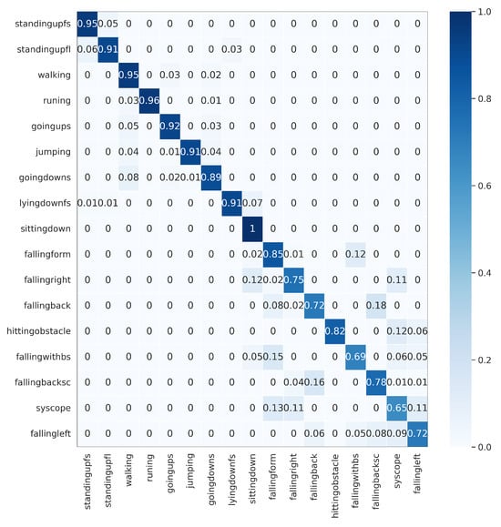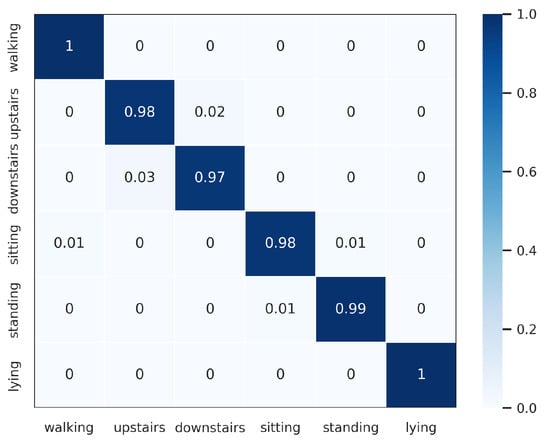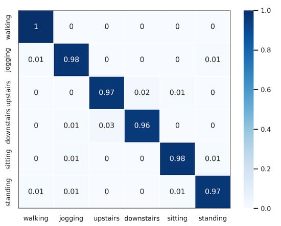In order to further verify the outperforming of the proposed method for each class label on each HAR dataset, we normalized confusion matrixes, which are shown in Figure 3, Figure 4, Figure 5, Figure 6 and Figure 7. The confusion matrix of three datasets such as WISDM, UCI-HAR, and Heterogeneous, is composed of six activities in Figure 3, Figure 4 and Figure 5, respectively. The confusion matrixes show that our proposed method performs well in distinguishing six simple activities. Specifically, the performance of six simple activities on three datasets such as WISDM, UCI-HAR, and Heterogeneous outperforms by 95% to 99% accuracy measure. In several specific cases, the accuracy performance of walking activity is 100%. Figure 6 and Figure 7 show the confusion matrix of PAMAP2 and UniMiB SHAR that DWCNN is effective well on both simple and complex activities. The reason is that DWCNN can leverage complementary information from both spatial and temporal domains to compute more discriminative complex activities. Therefore, DWCNN can improve the performance of HAR classification. However, several class labels of UniMiB SHAR are only higher than about 70% (such as syscope, fallingleft, fallingbacksc, fallingwithbs, fallingback, and fallingright). The main reason may be their interfering class labels and the number of samples for their class labels is not enough for distinguished learning.