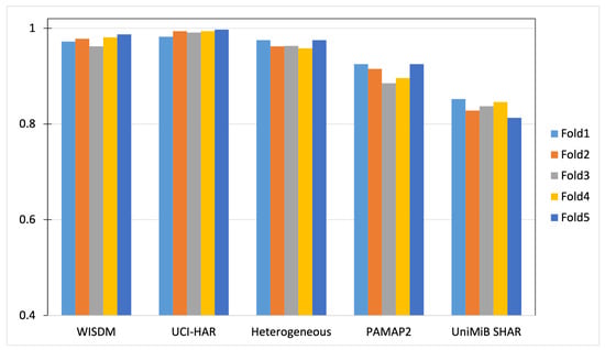 We perform a five-fold cross-validation for all datasets to evaluate the generality of the proposed DWCNN method. The five-fold cross-validation processing is performed as follows. Each dataset is randomly partitioned into five folds, in which each fold is held out in turn and the training is performed on the rest four-fifths. Thus, the learning processing is executed overall five times on different training sets. The accuracy results are shown in Figure 8. The performance of DWCNN on three datasets such as WISDM, UCI-HAR, and Heterogeneous, obtains more than a 97% accuracy measure. The performance of DWCNN on PAMAP2 has more than a 92% accuracy measure. On UniMiB SHAR, accuracy is more than 82%. The performance of DWCNN on WISDM, UCI-HAR, and Heterogeneous is higher than PAMAP2 and UniMiB SHAR. Several significant reasons are the number of class labels, the type of activities (simple activity, complex activity), and the ratio between the number of class labels with total samples. Specifically, three datasets such as WISDM, UCI-HAR, and Heterogeneous have six class labels with simple activities, whereas PAMAP2 and UniMiB SHAR have twelve and seventeen class labels including simple and complex activities, respectively. UniMiB SHAR has a large number of class labels but the number of samples for each class label is small. Therefore, UniMiB SHAR does not have enough samples for the training model to distinguish activities.