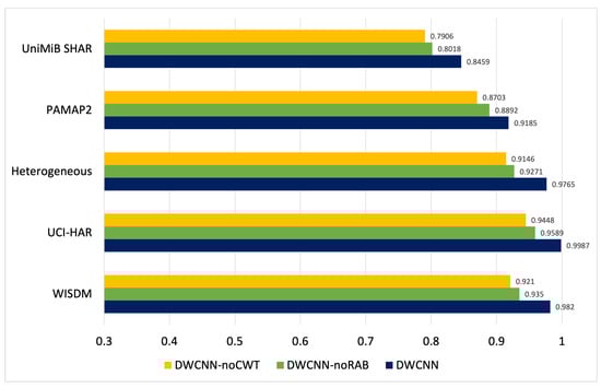 Ablation experiments with two models such as DWCNN-noCWT and DWCNN-noRAB are examined to thoroughly evaluate the suggested DWCNN model. The first method, DWCNN-noCWT, is implemented to test the effectiveness of the learning original signal by combining RABs with CNN without CWT. The second method, DWCNN-noRAB, evaluates the effectiveness of learning CWT and CNN models without RAB. The accuracy results of comparing three models on five datasets are shown in Figure 9. The DWCNN performance outperforms the two compared variants (DWCNN-noCWT and DWCNN-noRAB). The DWCNN performance is higher than DWCNN-noCWT by about 5%, 4%, 6%, 5% and 6% on UniMiB SHAR, PAMAP2, Heterogeneous, UCI-HAR, WISDM, respectively. This indicates that the CWT phase in DWCNN has a significant role in the DNN. Based on CWT, the original sensor signals were processed from the time domain into the time-frequency domain with meaningful spectrogram images. In addition, combining RAB and CNN architecture in the proposed method is suitable for spectrum images. The DWCNN performance is higher than DWCNN-noRAB by about 4%, 3%, 4%, 4% and 5% on UniMiB SHAR, PAMAP2, Heterogeneous, UCI-HAR, WISDM, respectively. Specifically, on the WISDW dataset, the DWCNN-noCWT, and DWCNN-noRAB have a classification accuracy of 92.16% and 93.59%, respectively, while the DWCNN acquires a better result of 98.26%. With UCI-HAR, the DWCNN-noCWT, DWCNN-noRAB, and DWCNN have a classification accuracy of 94.48%, 95.58%, and 99.87%, respectively. The accuracy results of DWCNN-noCWT, DWCNN-noRAB, and DWCNN models are 91.46%, 92.71%, and 97.65% on the Heterogeneous dataset. The accuracy results of DWCNN-noCWT, DWCNN-noRAB, and DWCNN models are 87.03%, 88.92%, and 91.85% on the PAMAP2 dataset. On the UniMiB SHAR, the accuracy of DWCNN-noCWT, DWCNN-noRAB, and DWCNN models are 79.06%, 80.18%, and 84.59%, respectively.