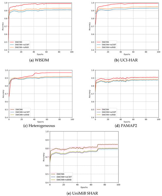 In order to evaluate the effectiveness of the proposed method with two variant methods, the number of training epochs is constantly set to 100 during the whole experiment. As accuracy results following epochs from five public datasets such as WISDM, UCI-HAR, Heterogeneous, PAMAP2, and UniMiB SHAR, respectively, such as Figure 10a–e, the DWCNN model’s performances outperforms DWCNN-noCWT and DWCNN-noRAB models. Therefore, the CWT phase and RAB significantly contribute to the performance gain when compared with two variant baselines across five public datasets. Especially, there is an increase of about 4% and 6%, respectively, over the DWCNN-noRAB and DWCNN-noCWT models on all datasets.