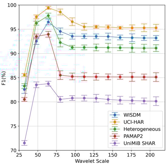 We implement our proposed method on five datasets with different scale parameters to evaluate the effectiveness of finding the scale optimization parameter in Algorithm 1. The averaging F1 results are given in Figure 11. The results show that the best number of wavelet scale parameters for both datasets is 64. It can be found that increasing the scale size from 32 to 64 tends to improve the performance of the model. When the scale size is more than 64, the model’s performance decreases and tends to stabilize after a certain scale size. The reason is that CWT can be able to extract time-frequency information. The smaller scales, such as , , and , correspond to high frequencies and thus predominantly consist of noise in raw signals. When we go up in scale (i.e., in , ), we observe bright light corresponding to the activity. However, we can lose the signal in the larger-scale coefficients (i.e., more than ), which are associated with low-frequency information.
