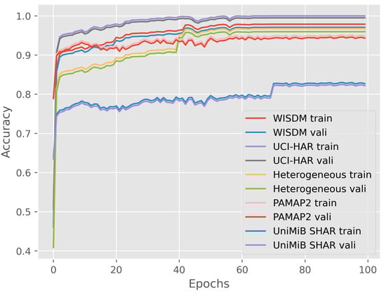 We investigate the number of training epochs to give the proposed model enough space. Figure 12 shows the training and validation accuracy along training epochs on five datasets. Accuracy is calculated as the number of correct predictions divided by the total number of predictions made by the model. Reviewing the learning curves, we can see that the model of the proposed method converges well with performance on the validation dataset at around 40 epochs with WISDM, UCI-HAR, Heterogeneous, and PAMAP2 datasets. The improvement trend continues with the UniMiB SHAR at around 70 epochs. The results imply that the number of training epochs of the DWCNN model is small to obtain effective performance on all datasets. Therefore, DWCNN is a generality architecture model for multimodal sensor-based HAR.