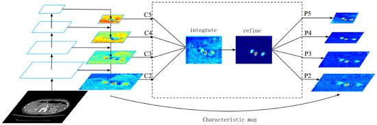In order to fuse the multi-level feature map and retain its semantic information, we first adjust the multi-level feature map {} to the middle size. Then, interpolation and maximum pooling are performed, respectively. The feature maps at all levels are rescaled to the same size, and the balanced semantic feature map is obtained by adding and averaging. The calculation formula is shown in Equation (1):