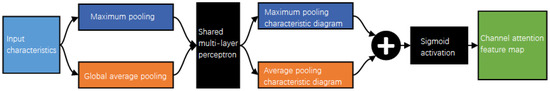 The channel attention module gives weight according to the importance of the characteristic map of different channel dimensions. The input feature map is passed through and , respectively, and then the features after and are input into the shared network composed of multi-layer perceptron (MLP), respectively, and the output features are added and sigmoid activated to generate the final channel attention feature map ; that is, the dimension is . The calculation expressions are shown in Equations (2) and (3):