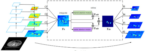 In terms of refining and improving the balanced semantic features, the more refined balanced semantic features are more discriminative. To this end, we refined and improved the features by adding attention modules. Refined and improved operations help us enhance the integration function and further improve the results. Then, output the corresponding {}, which is used in the target detection process after FPN.