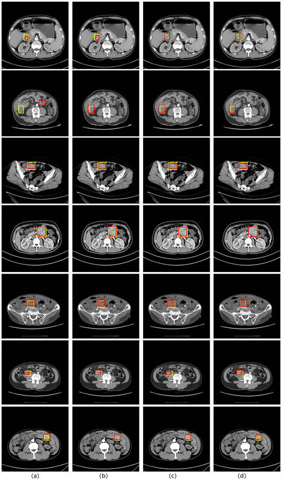 Through three different sets of comparative experiments, we observed that ABFP can better improve the performance of detection models of different structures under SIST data, and can be combined with different feature pyramid algorithms. The comparison diagram of test results is shown in Figure 6, which is represented by the Cascade RCNN network. The yellow rectangle in the diagram is the doctor’s mark, and the red rectangle is the model test result. In Figure 6, we can find that after the addition of the attention mechanism, the accuracy rate of stromal tumor detection is significantly improved. The detection results of the detection model without the addition of attention mechanism in the first and sixth lines are significantly different from the doctor’s label, especially in the second line, we can find that the model without the addition of attention mechanism has misdetection. The model with the addition of an attention mechanism can more accurately match the doctor’s label. In addition, we can find that for small stromal tumors, the ABFP algorithm proposed in this paper has better detection performance than SE and CBAM algorithms, and in the face of medium and large stromal tumors, the ABFP algorithm also better matches the doctor’s label.