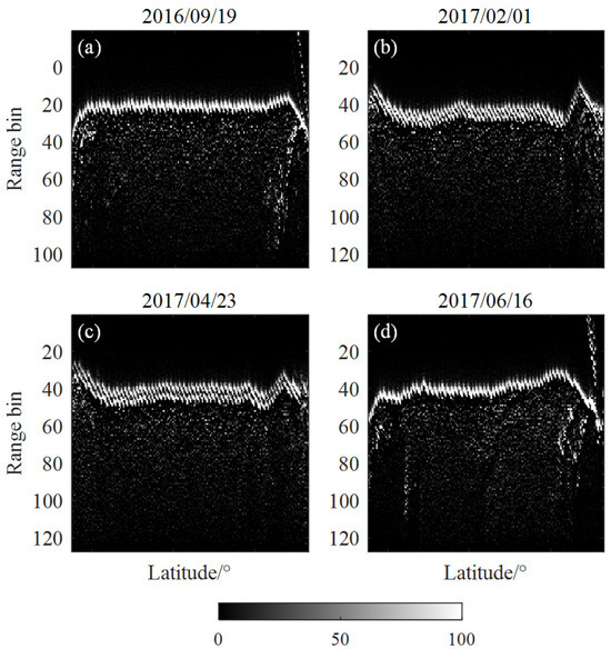 The altimetry radar waveforms show specific features on snow-covered lakes. For example, for the Sentinel-3 Ku-band waveforms, a stepped break appears at the waveform leading edge due to double backscattering from the presence of ice. Figure 3 shows the waveform overlays at Great Slave Lake on 19 September 2016, 1 February 2017, 23 April 2017, and 26 June 2017, respectively, representing the lake surface covered with open water, lake ice, lake ice, and open water, respectively. Where the columns in each subplot represent waveforms collected during a cycle along the latitudinal direction, the color gradient indicates the change in the power difference between adjacent bins of the waveform, with bright spots representing an increase and dark spots representing a decrease or maintenance of waveform power. Only one distinct bright band in Figure 3a,d corresponds to the lake surface signal from open water. In Figure 3b,c, the presence of two distinct bright bands representing the two leading-edge stages corresponds to the reflected signals from the surface and bottom of the lake ice, with the spacing of the two bright bands in Figure 3c being larger than the spacing of the bright bands in Figure 3b due to the thickening of the lake ice over time.