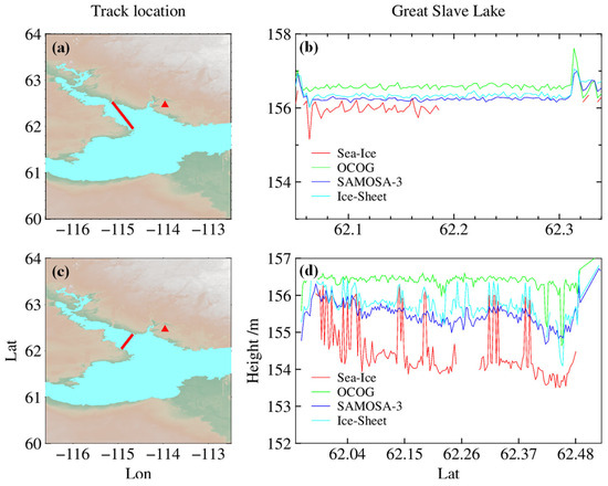 The algorithm proposed in this article only applies when the lake is covered with ice. However, the standard retracking algorithm is still used for water level estimation at other times, so evaluating the accuracy of several standard retracking algorithms is necessary. Sentinel-3 has four standard retracking algorithms for estimating water level in SAR mode: OCOG for sea ice margins [70], SAMOSA-3 for ocean surface [71], ice sheet for ice cover [72], and sea ice [73]. Figure 6 shows the ground tracks of tracks 37 and 681 that crossed Great Slave Lake on 27 September 2017 and 13 March 2018 and compares the water levels obtained using different retrackers. As seen from Figure 6b,d, the sea ice re-tracker has a high data loss rate when retrieving water levels in open waters and large data fluctuations when retrieving water levels in frozen lakes, so subsequent analysis will not be discussed later.
