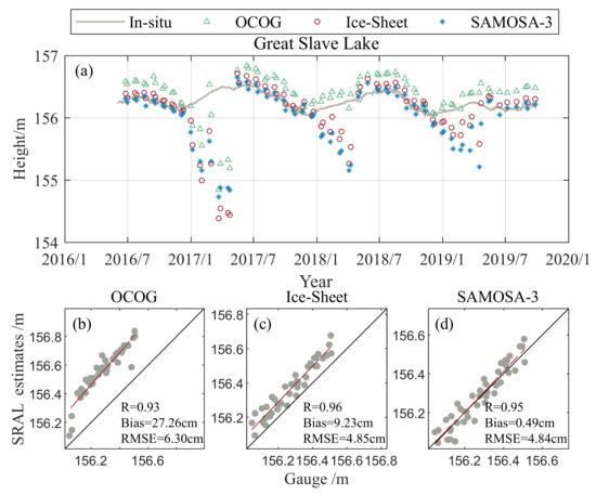 The accuracy of the remaining three SRAL SAR retrackers is evaluated to study the accuracy of the water level estimation of different algorithms under different lake surface conditions. Since Great Slave Lake is entirely covered with ice in winter, it is discussed in this section. Figure 7a shows the time series of water levels estimated using the three standard retracking algorithms and the in situ measurements from 2016 to 2019. The results indicate that the three standard retracking algorithms are less accurate in estimating water levels when the lake surface is covered with ice in winter. However, compared with the measured water level, the water level estimation is more consistent in other seasons, and the three algorithms only apply to the ice-free period. Therefore, only the accuracy of three standard retracking algorithms in the ice-free condition of the lake is analyzed in this section. Figure 7b–d shows the correlation plots between the water levels estimated using the three retracking algorithms and the measured water levels during the ice-free period. The bias of OCOG, ice sheet, and SAMOSA-3 are 27.26 cm, 9.23 cm, and 0.49 cm, respectively; the correlation coefficients (R) are 0.93, 0.96, and 0.95, respectively; the RMSE are 6.30 cm, 4.85 cm, and 4.84 cm, respectively. The results show that the water levels in open water obtained using the three retrackers have a high degree of agreement compared with the measured values. Among the three algorithms, SAMOSA-3 exhibits the highest accuracy in estimating water levels in open water.