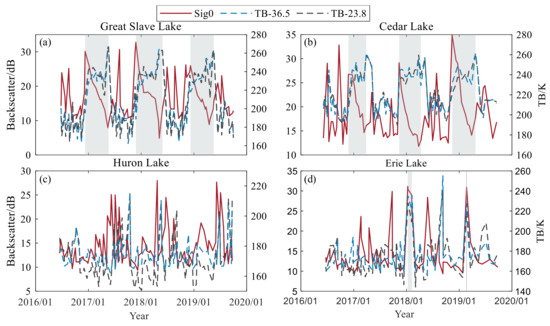 Time series variation of backscatter coefficient and brightness temperature during 2016–2019. (a) Great Slave Lake, (b) Cedar Lake, (c) Lake Huron, (d) Lake Erie. The gray background shading represents the presence of lake ice.