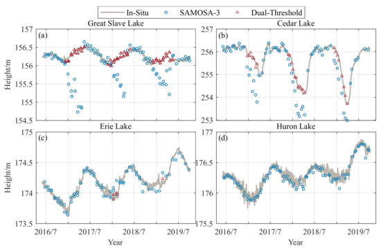 To better demonstrate the performance of the dual-threshold, the complete water level series and the measured values for three ice seasons from June 2016 to October 2019 are compared separately. Table 5 shows the comparative analysis of water levels obtained using the dual-threshold, the SAMOSA3, and the measured water levels for the nine lakes studied. When the data field in the dual-threshold column is “/”, it indicates no ice cover during the three years. When the lakes in Canada were covered with ice, the accuracy of dual-threshold was significantly higher than that of the SAMOSA-3, especially for Great Slave Lake, where R improved from 0.08 to 0.92, the bias decreased from −25.58 cm to 0.37 cm, and the RMSE decreased from 45.75 cm to 5.90 cm. For Lake Erie, R remains unchanged, the bias decreases from 8.58 cm to 7.40 cm, and the RMSE decreases from 6.89 cm to 5.01 cm. The slight improvement is because only two small ice epochs were observed near the selected hydrological station, and the ice epoch had little influence. These results demonstrate that the dual-threshold algorithm can provide continuous and stable water levels with sufficient accuracy for lakes.