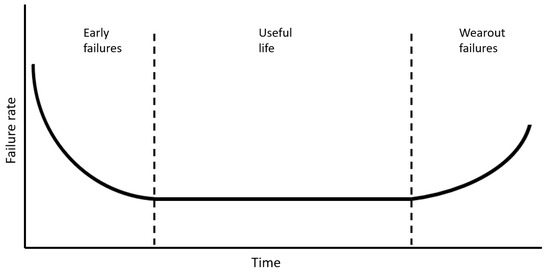 The literature (e.g., FEMP, 2010 [13]; NASA, 2008 [14]; Smith, 2022 [15]; Souza, 2021 [16]) indicates that a graphical representation of the failure rate of a population of components versus time would probably be in the form of a “bathtub”, as shown in Figure 1. In this representation, the Y-axis indicates the rate of failure, whereas the X-axis corresponds to time. Based on its shape, the curve can be divided into three distinct zones: early failures, useful life, and wear-out failures (FEMP, 2010 [13]; NASA, 2008 [14]; Smith, 2022 [15]; Souza, 2021 [16]).