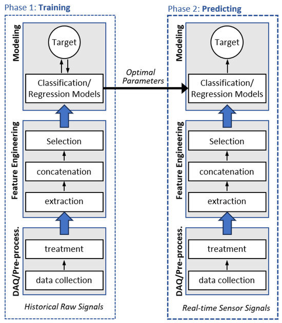 According to Zhang and Yang (2019) [18], data-driven predictive maintenance consists of two phases, as shown in Figure 2. First, a learning process (i.e., model training) is required based on historical raw sensor signals, and second, the trained model is applied to predict targets and make decisions.