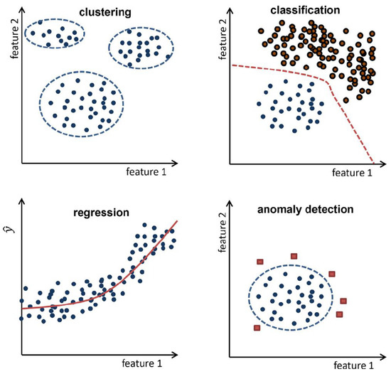 According to Theissler et al. (2021) [17], the most relevant machine learning tasks for PdM applications are (i) clustering, (ii) classification, (iii) regression, and (iv) anomaly detection (illustrated in Figure 3).