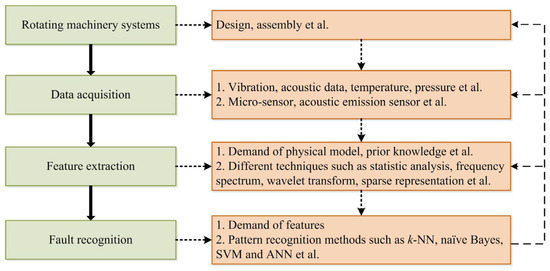 Therefore, fault diagnosis can be essentially thought of as a pattern recognition problem regarding the state of rotating machines (Liu et al., 2018 [26]). Moreover, artificial intelligence (AI), serving as a potent tool for pattern recognition, has garnered significant interest among many researchers and holds potential for use in the field of fault detection in rotating machinery. Specifically, classifiers and statistical learning methods have been widely used in the fault diagnosis of rotating machinery, including the k-nearest neighbor (k-NN) algorithm, naive Bayesian classifier (NB), support vector machine (SVM), and multi-layer perceptron (MLP) (Lang et al., 2021 [25]; Liu et al., 2018 [26]; Alshorman et al., 2020 [27]; Dias, 2019 [29]). Figure 4 shows a standard fault diagnosis framework for the operation and maintenance of engineering systems.