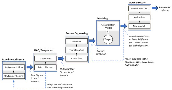 In this section, the models used and the entire training process of the algorithms for the predictive tasks of detecting and diagnosing anomalies in applications driven by electric motors are presented. Guided by the literature, we chose to employ widely recognized statistical classifiers and commonly utilized learning methods to diagnose faults in rotating machinery, including k-nearest neighbor (k-NN), the naive Bayes classifier, support vector machine (SVM), and multi-layer perceptron (MLP).