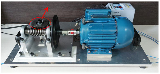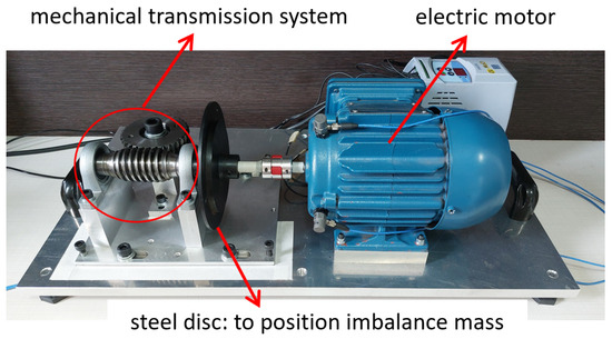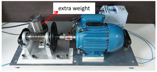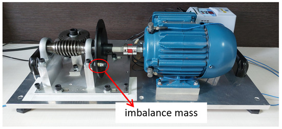 The electromechanical device used was based on the test bench presented by Dias (2019) [29], with modifications mainly to the type of engine used and the method of applying overload in the electromechanical system. It consists of a worm-gear transmission system with a crown gear coupled to the shaft of an electric cage motor. Between the mechanical transmission system and the electric motor, a steel disc with a diameter of 130 mm was installed. This steel disc was adopted to position an imbalance mass 60 mm from the center of the shaft. Figure 6 shows the electromechanical device.