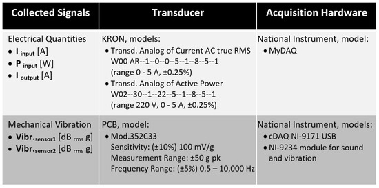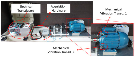 The instrumentation consisted of transducers and data acquisition hardware, as illustrated in Figure 7. These components were employed for collecting data on electrical magnitudes and mechanical vibrations from the electromechanical device. The data acquisition and storage platform was developed in LabVIEW using National Instruments (NI) acquisition hardware.