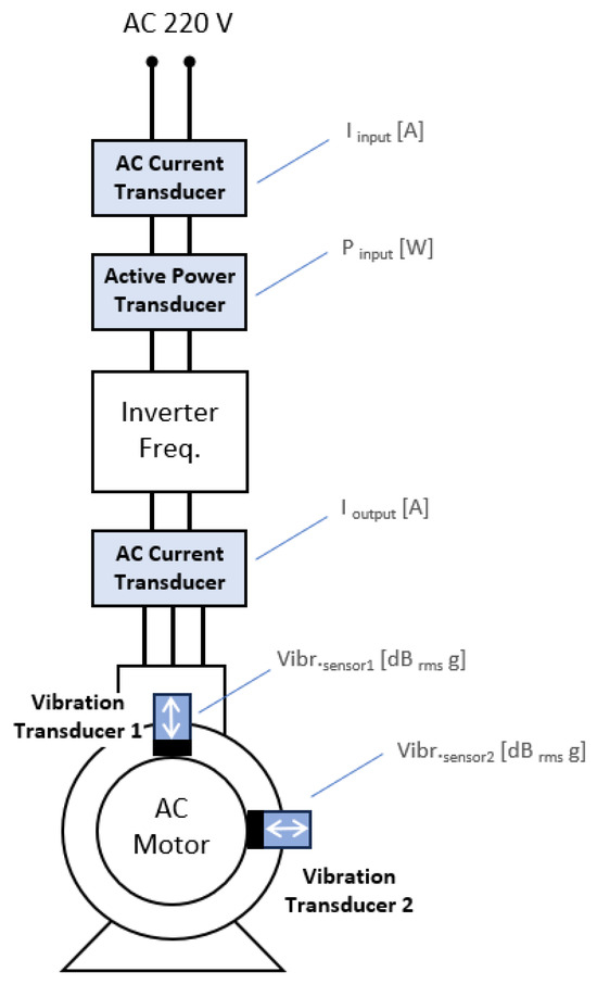 As shown in Figure 8, a current transducer and a power transducer were utilized before the frequency inverter to capture the “I input [A]” and “P input [W]” signals, respectively. Another current transducer was employed after this motor drive to acquire the “I output [A]” signal. Additionally, the accelerometers (mechanical vibration transducers) were arranged at 90° angles to each other, with one of them positioned vertically at the top of the electric motor aligned with the shaft support bearing.